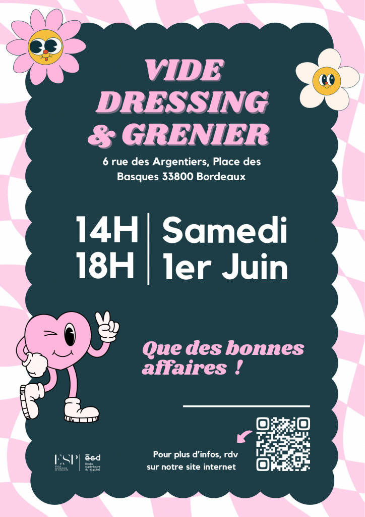 👗🛍️ Vous cherchez à donner une seconde vie à vos vêtements ou certains de vos objets? Rejoignez-nous lors du Vide Dressing & Grenier au Campus Place des Basques de l’école supérieure de publicité et l’école supérieure du digital de Bordeaux le Samedi 1er juin 2024 !